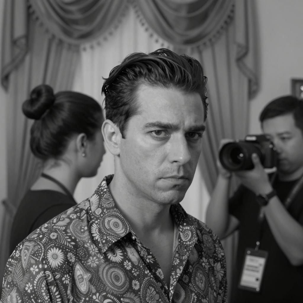 Photograph of a passport with a photograph of a man with dark hair, black jacket, and blue shirt, arms raised. Passport partially covers a green passport with "PASSPORT" . Black background. Man's face intense. Two passports.