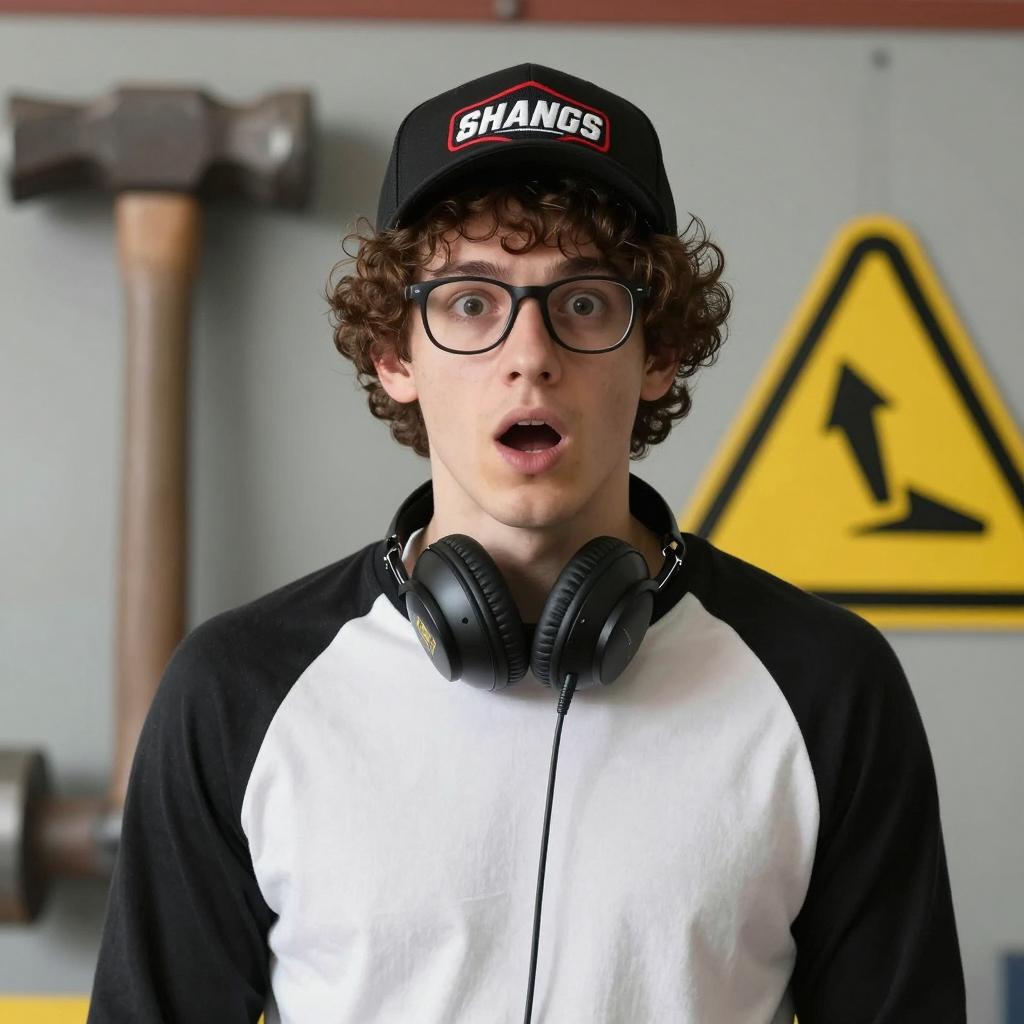 Young man with curly hair, wearing glasses, black-and-white raglan shirt, and black baseball cap with red and white , shocked expression, headphones on, industrial background with large hammer and yellow caution label in the background.