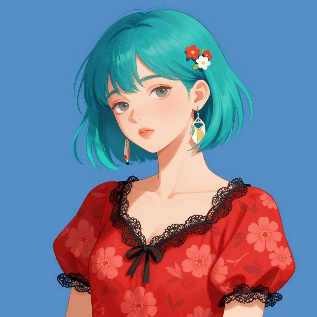 A digital illustration of a young woman with short teal hair adorned with small flowers, wearing a red floral-patterned dress with black lace details and statement earrings. The artwork features a modern anime-inspired style with soft shading and vibrant colors, capturing a contemplative expression against a simple blue background.