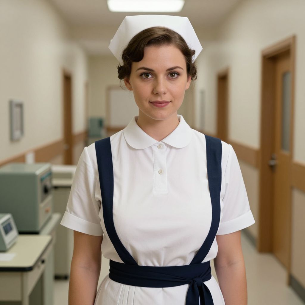 A realistic photograph of a young woman in her early 30s wearing a classic 1930s nurse uniform with a white cap, white dress with pleated sides, navy blue sash, and soft cotton blouse, standing in a well-lit hospital hallway from the 1930s, with vintage medical equipment and wooden hospital doors in the background, her face gentle and composed, eyes looking directly at the camera with a calm and professional expression.. The woman has big tits and cute face