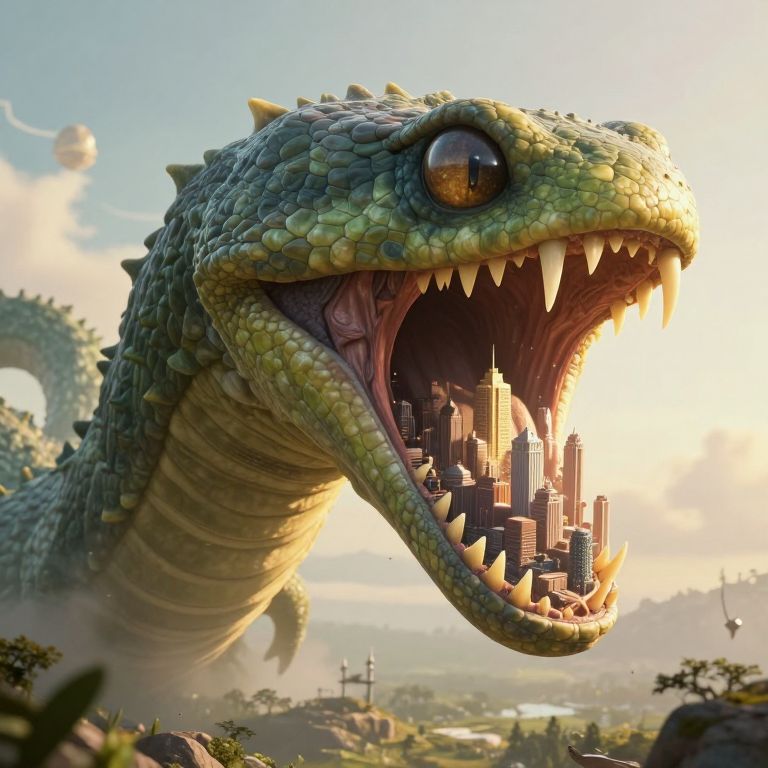Photorealistic CGI of a massive green dragon with yellow eyes and sharp teeth, open mouth swallowing a cityscape, sunlit sky, and distant landscape