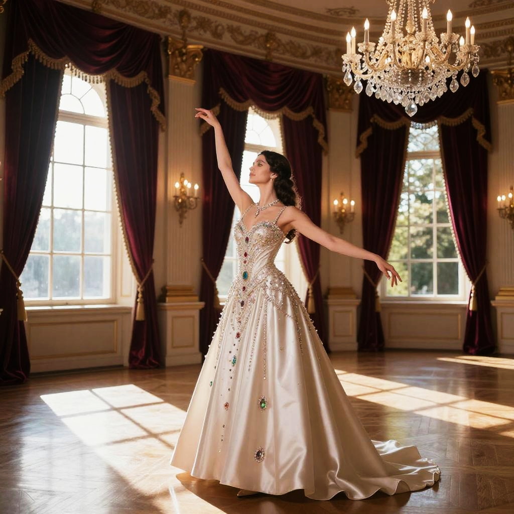 (dynamic pose, feminine photo by Alessio Albi, style of Oleg Oprisco:1.4), (solo focus, cinematic photoshoot of perfect seductive young woman in Victorian Ballroom with Ghostly Apparitions:1.3), grand Victorian ballroom, candles flickering as spectral dancers waltz, their translucent forms casting eerie shadows on ornate tapestries and gilded mirrors.