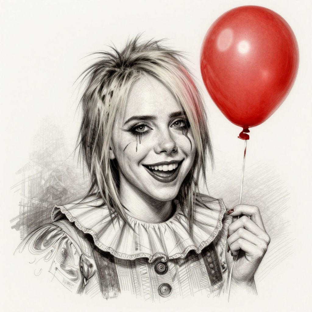 Surrealism grunge cartoon portrait sketch of billie eilish with a wide smile and a red balloon by - michael karcz, loony toons style, pennywise theme, horror theme, detailed, elegant, intricate