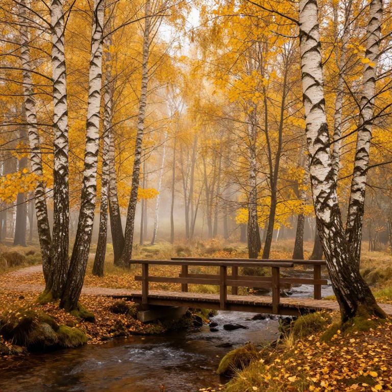 Swedish forest in autumn, golden leaves falling from birch trees, a small wooden bridge over a clear stream, misty morning light creating a mystical feeling, intricate details of nature, peaceful and reflective mood.