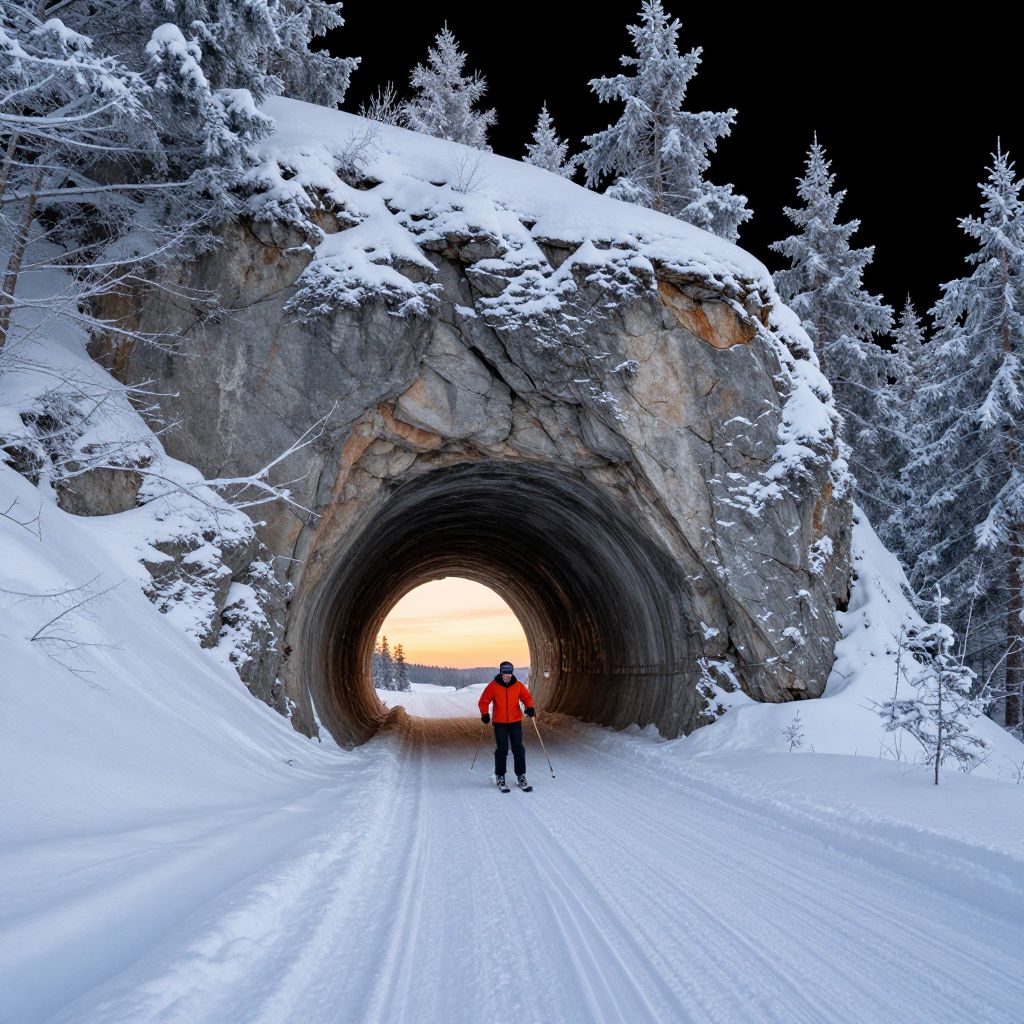 Photograph of five children ice skating on a frozen river at sunset. The children, dressed in colorful winter jackets—pink, black, gray, and white—are skating in a line. Tall, dark pine trees frame the river on both sides, with steep, rocky cliffs in the background. The sun is setting in the distance, casting a warm orange glow across the sky and reflecting off the ice. The children are silhouetted against the bright sunset, with the smooth ice surface reflecting their movements. The scene is serene and picturesque, capturing the beauty of a winter landscape.