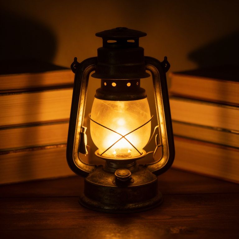 Photograph of a glowing, antique kerosene lantern with a warm yellow light, sitting on a wooden surface, blurred wooden shelves in the background,