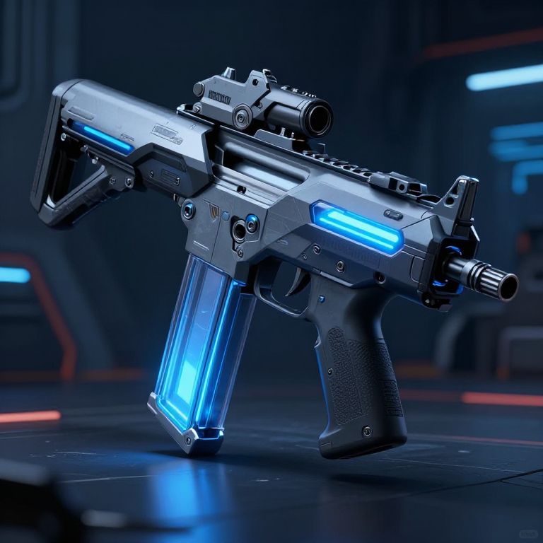 Futuristic assault rifle concept art, asymmetric design with angular shapes, transparent energy magazine, blue LED highlights, advanced recoil suppression system, set in a neon-lit futuristic armory, ultra-detailed illustration with sharp shadows.