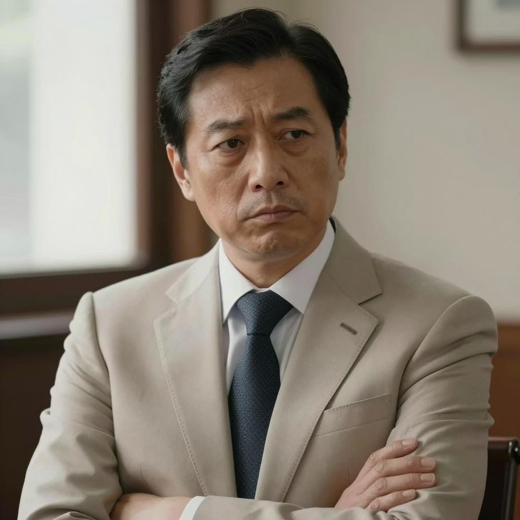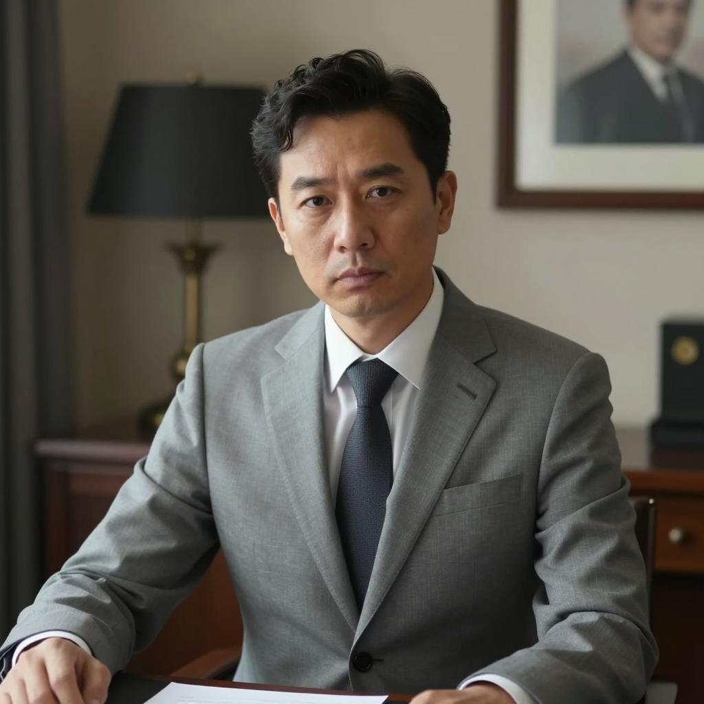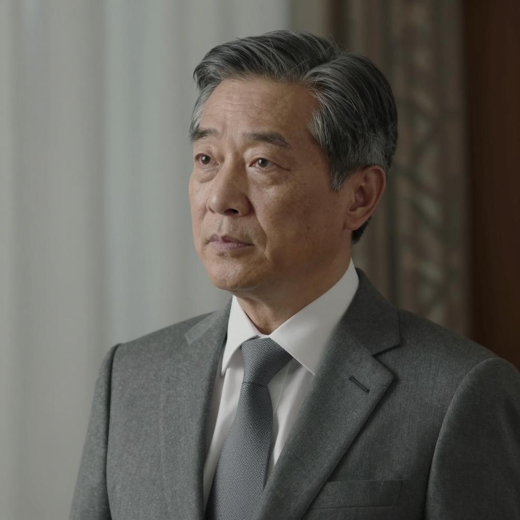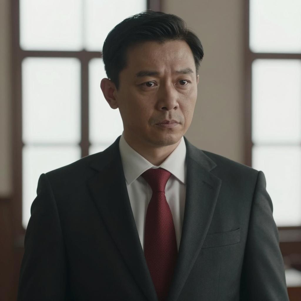 A man in a black suit and white shirt with a brown tie, standing on the right. Large close-up of his face on the left, wearing round glasses with binary code on them. Blue gradient background. Man's expression is serious. Dark and light shadows contrast his face and the background. Two people, man in suit and his face.