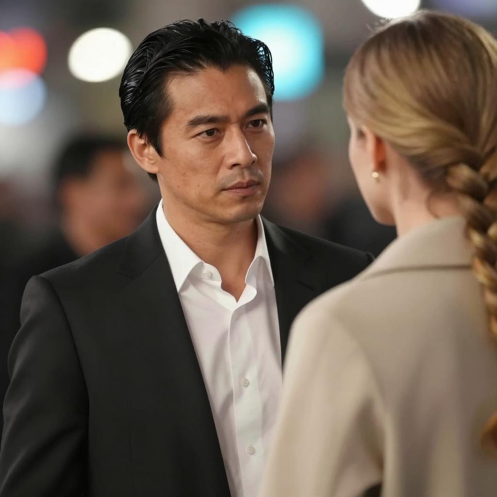 A man with dark, slicked-back hair, wearing a black suit and white shirt, looking intently at a woman with blonde, braided hair, wearing a beige coat. Background has blurred, colorful lights and indistinct figures. Man is centered, woman is to the right, with her back to the camera. Both have focused expressions.