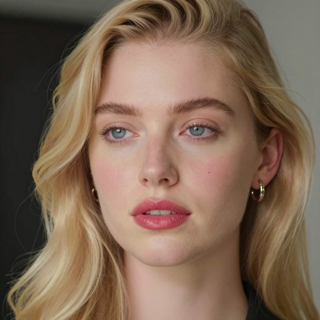 Photograph of a blonde woman with wavy hair, fair skin, and green eyes. She has bright red lipstick and long black eyelashes. Her head is tilted to the right, eyes partially closed, and lips slightly parted. Dark, blurred background. Close-up shot. She is wearing a thin gold necklace.