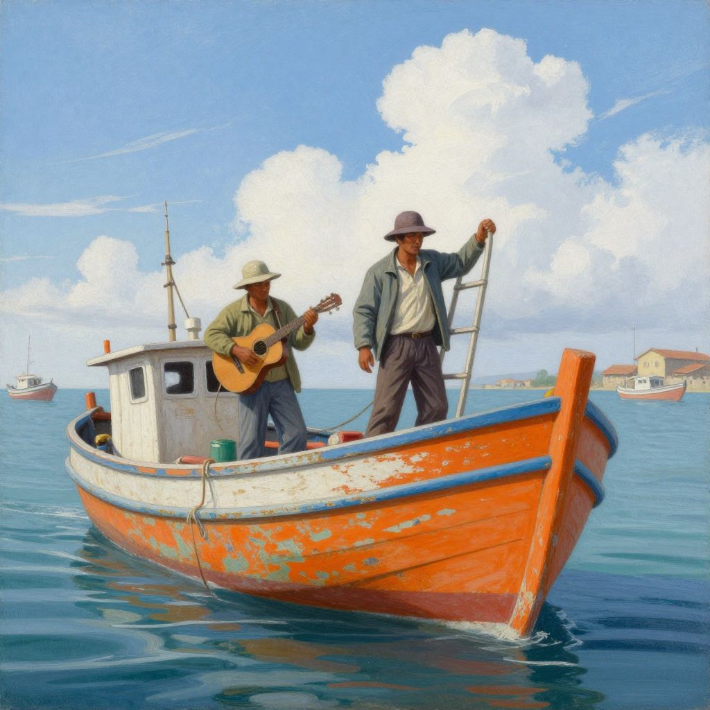 This is a digital painting in an impressionistic style, depicting a small, yellow and red sailboat anchored on a calm, reflective body of water. The boat's mast is tall and slender, rising from the center. In the background, there are several houses with red and gray roofs, surrounded by trees with autumn foliage. The sky is clear with a soft blue hue, and the water's surface reflects the colors of the boat and sky. The overall composition is serene, with a focus on the vibrant boat against the tranquil water and subtle background.