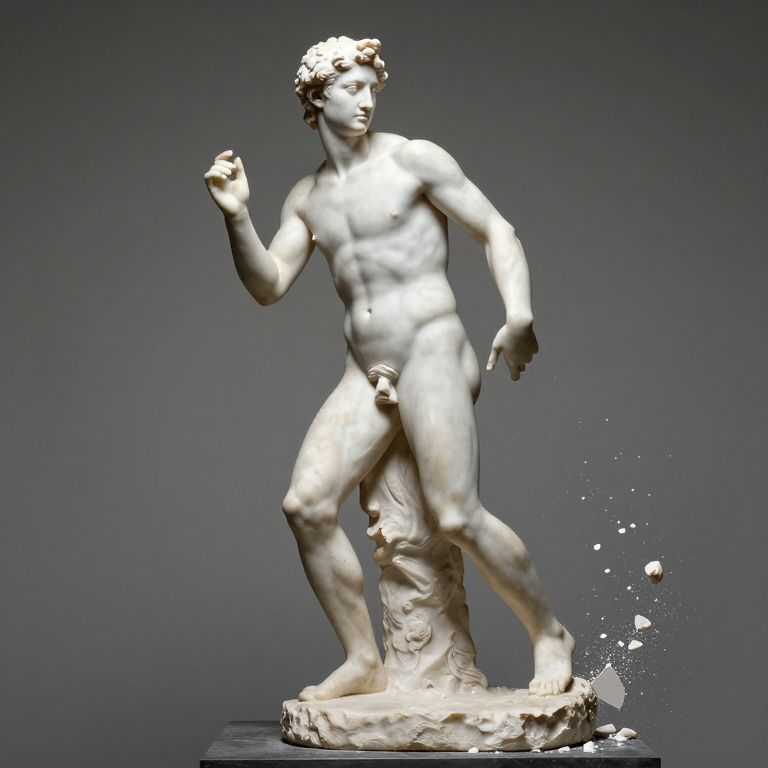 Photograph of a white marble statue of a nude, muscular male figure with detailed hair, standing in a dynamic pose, with broken fragments falling from the