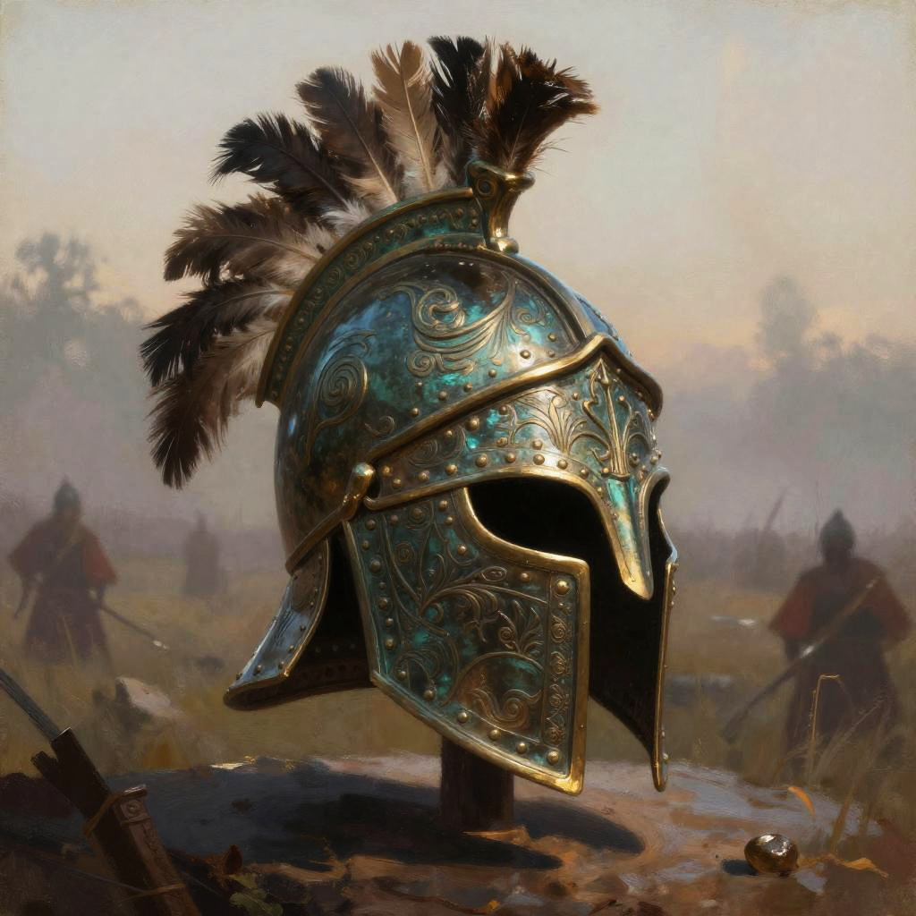 Casque of ancient warrior, ornate bronze helmet with intricate engravings and feathers, set against a misty battlefield at dawn, dramatic shadows highlighting craftsmanship, painterly realistic art style