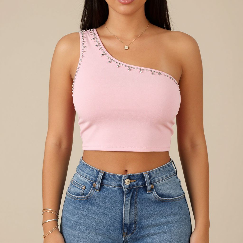 "Woman, casual chic, embellished crop top in pastel pink, asymmetric neckline, one-shoulder design with beaded accents, faded high-waisted skinny jeans, layered bracelets, delicate pendant necklace, neutral background with soft lighting.. Sexy. Pretty face and beаutiful eyes. Big breasts."