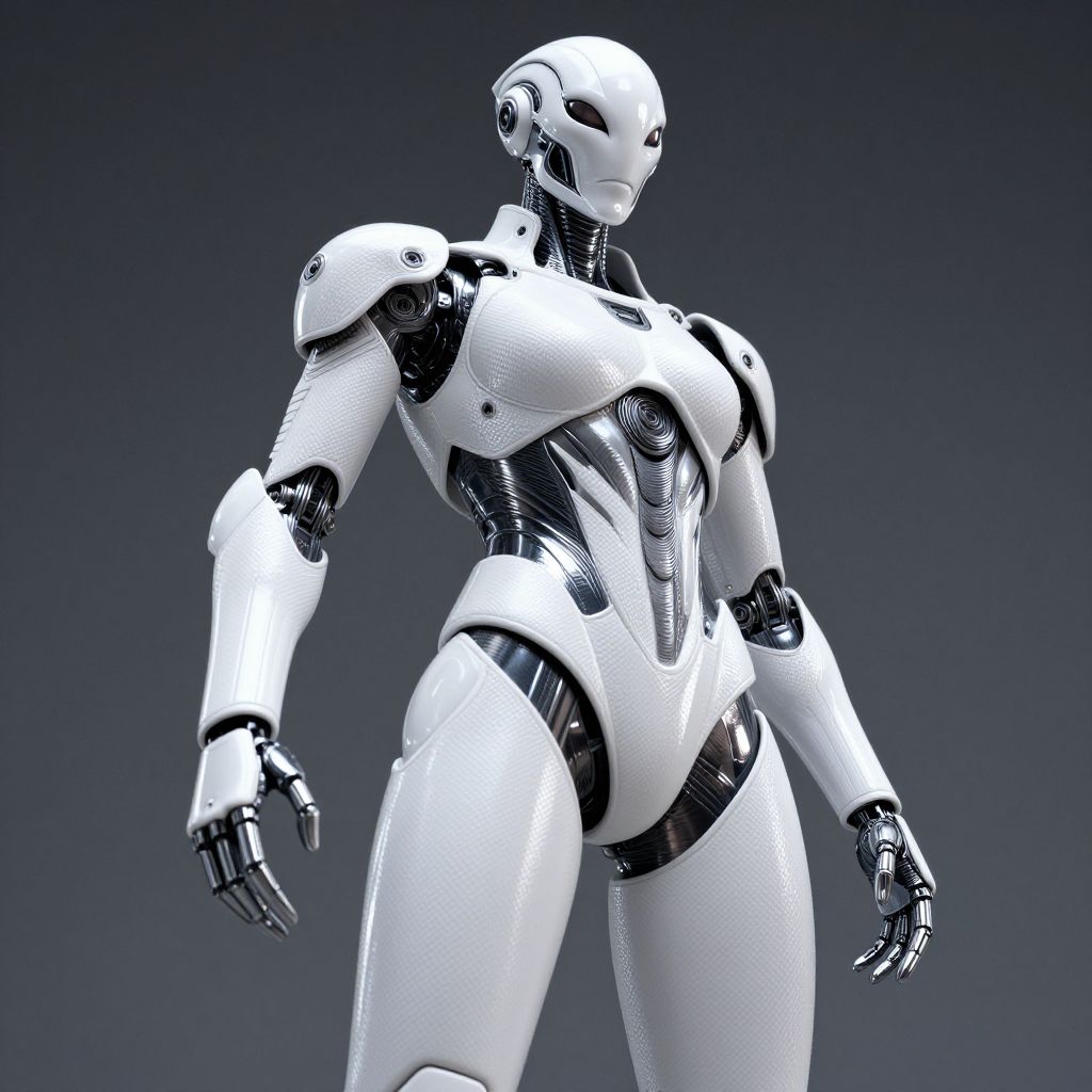 CGI-rendered, futuristic, white and black female humanoid robot with sleek design, glossy texture, and metallic joints, standing against a dark gradient background