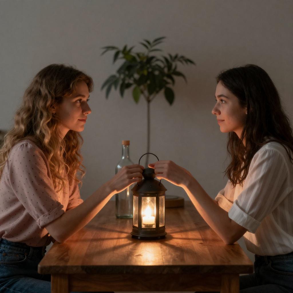 Photograph of two people sitting on an orange blanket outdoors. Both wear hats and winter clothing. One holds a bottle. Snow on the ground. Striped pants, denim jeans, brown boots. Grey stone wall with iron gate in background. Sitting closely, facing each other. Intense expressions.