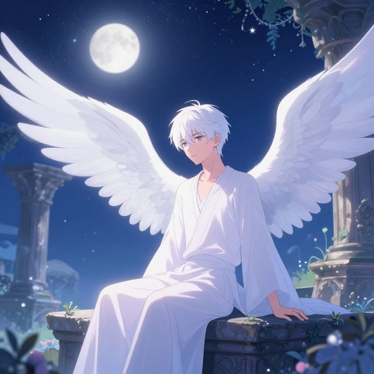 Serene male anime character with wings sitting on ancient ruins under a starry night, gentle moonlight illuminating his delicate white wings and calm face, soft pastel colors and detailed background of an enchanted forest, dreamy and peaceful fantasy anime style.