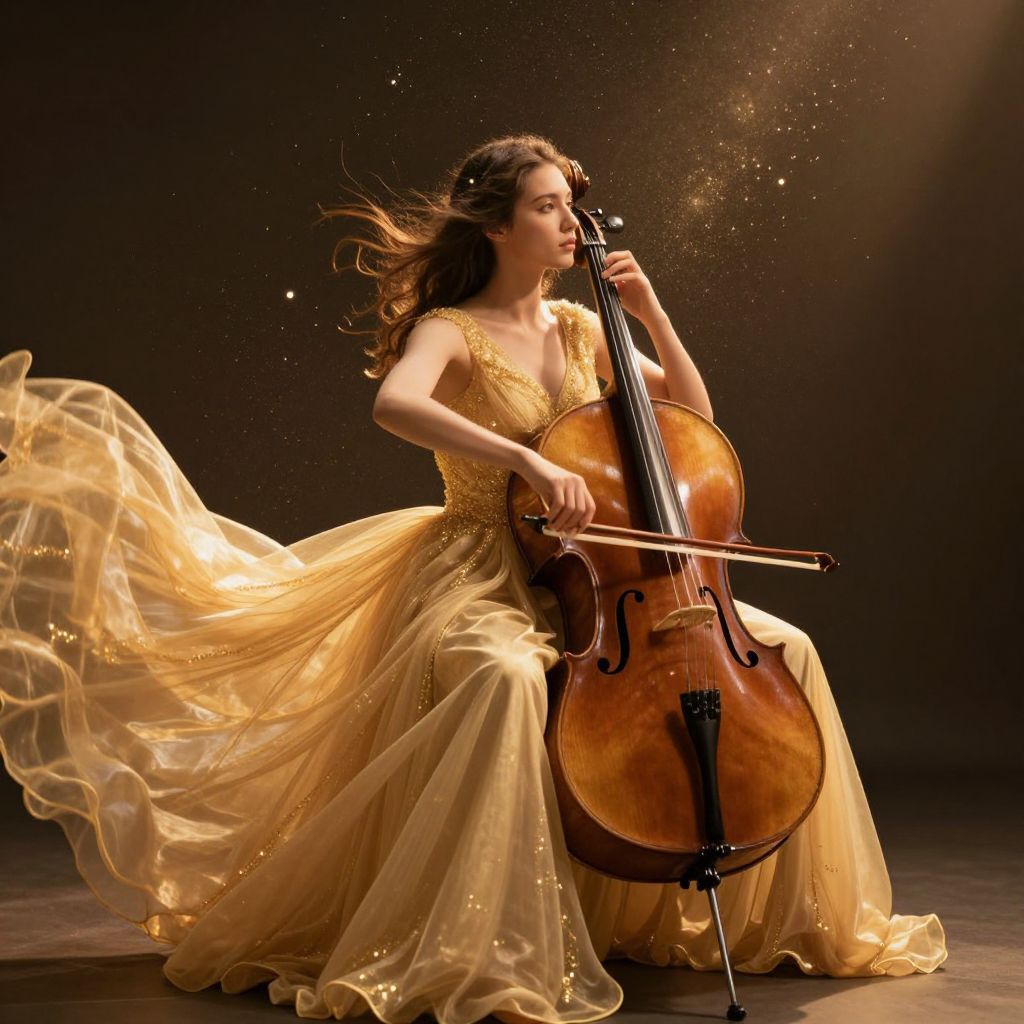 Ethereal light bathes a woman as she gracefully plays a polished cello, her flowing golden gown blending seamlessly with the shimmering particles that dance around her, creating a celestial ambiance.