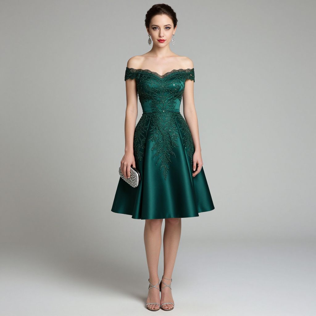 Photograph of a fair-skinned woman with dark brown hair styled in an elegant updo, wearing a dark green, off-the-shoulder, knee-length, vintage-style dress with intricate beadwork. She holds a small, silver clutch in her right hand and wears strappy, silver high-heeled sandals. Her makeup is classic with bold red lipstick. She stands against a plain, light gray background, centered in the frame, looking directly at the camera with a poised expression. The dress's A-line skirt flares out, and the dress's neckline is slightly scalloped.