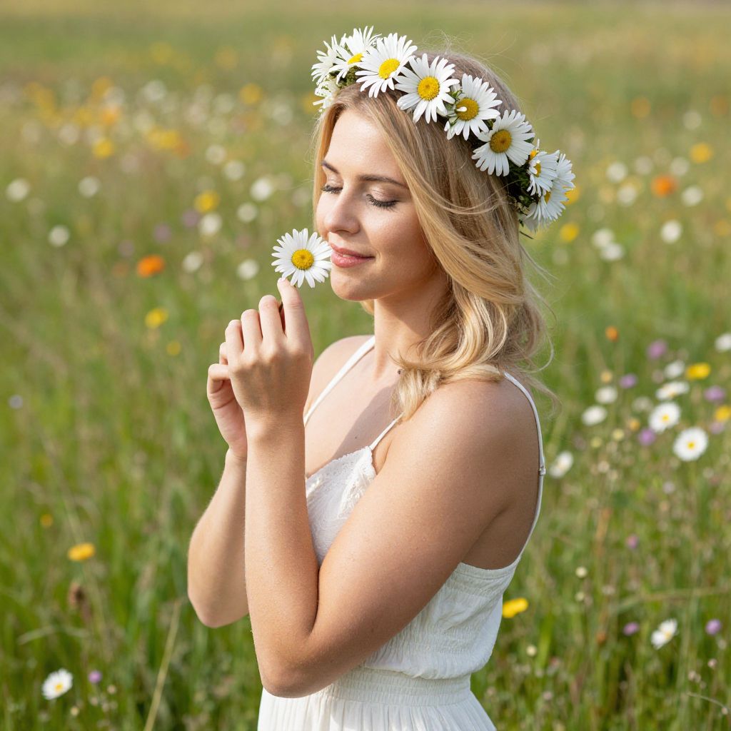 Photograph of a young woman with fair skin and brown hair, lying on her back in a lush meadow filled with wildflowers. She is wearing a white, lace-trimmed, sleeveless top and matching white shorts. Her eyes are closed, and her right arm is stretched above her head while her left arm rests on her stomach. The grass is green and dotted with small white, yellow, and purple flowers. The lighting is soft, casting a gentle blue tint over the scene, adding a dreamy, ethereal quality. The woman's relaxed, serene pose contrasts with the vibrant, natural background.