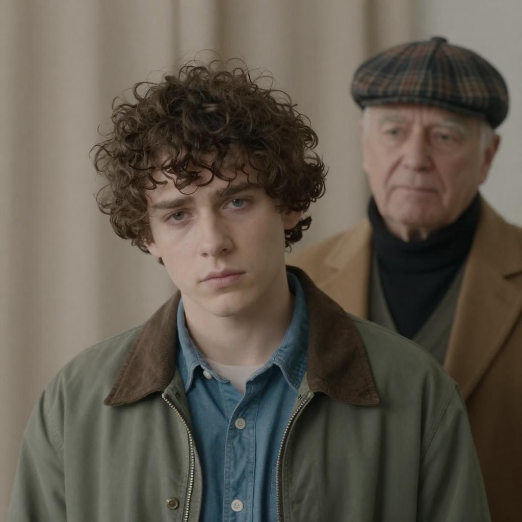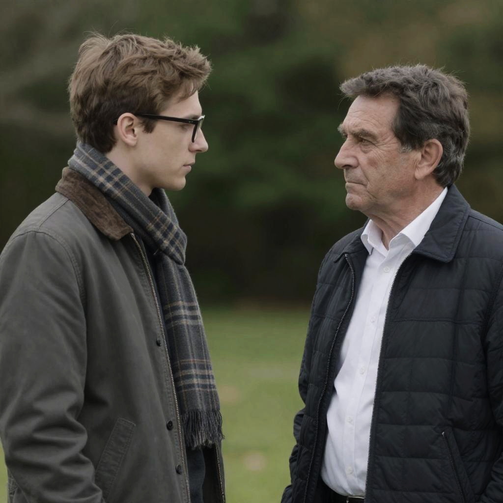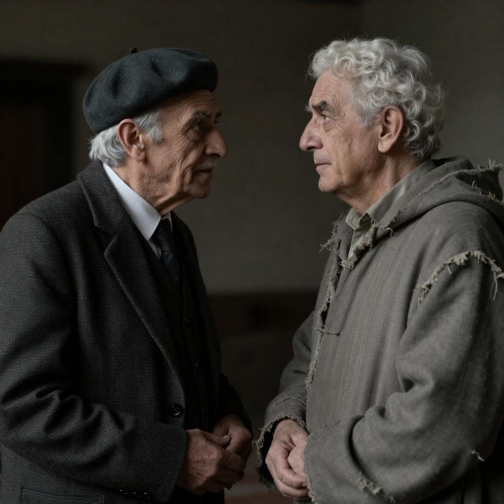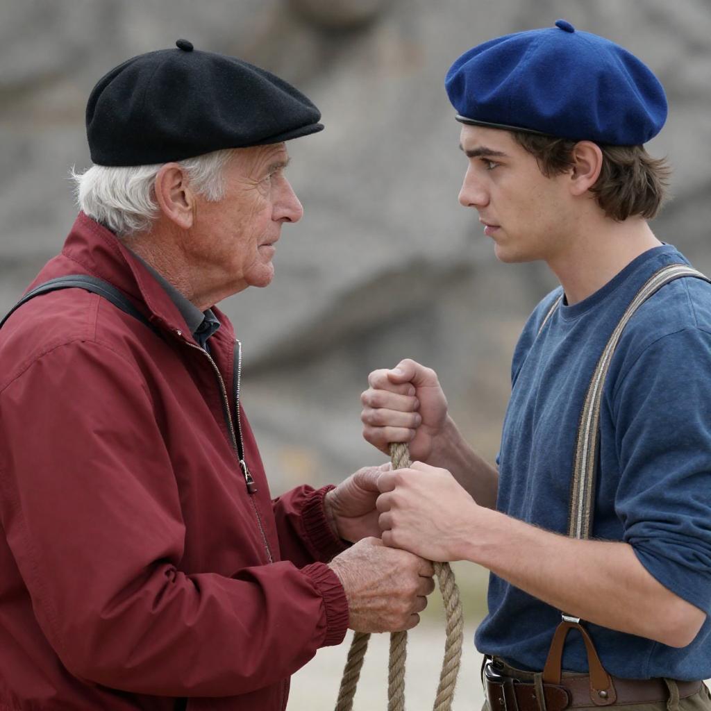 Two men, one older with white hair in a red jacket and black beret, the other younger with brown hair in a blue shirt and blue beret, holding a rope against a rocky background. The older man looks intently at the younger man. Both wear suspenders. The younger man's expression is focused. The rope is coiled between them.