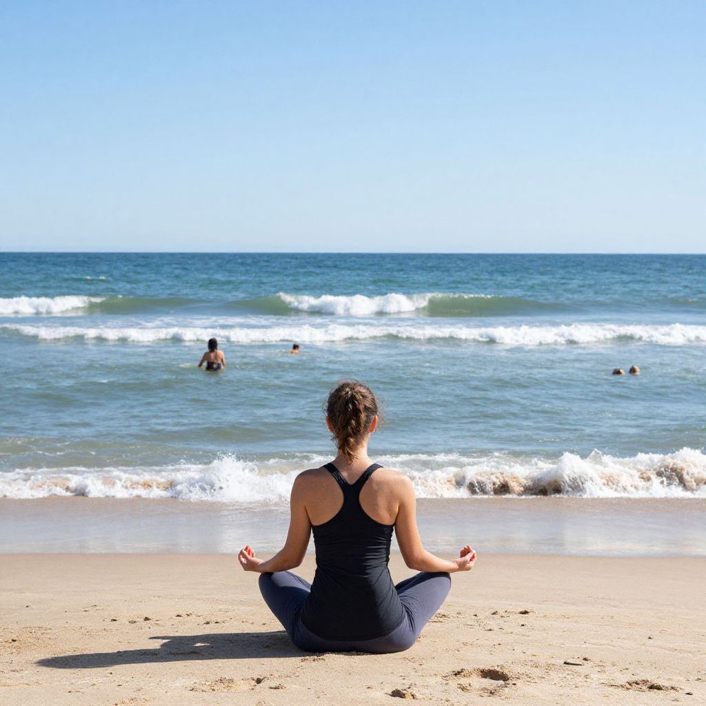 Woman meditating in a serene lotus position on Brighton Beach, facing the calm ocean with gentle waves and a few bathers enjoying the water under a clear blue sky.