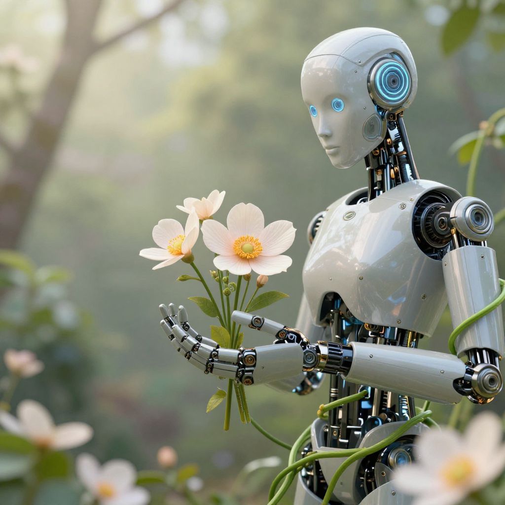 AI-fusion photos illustrating a harmonious blend of artificial intelligence and nature, robotic hands gently holding blooming flowers, bio-mechanical vines entwined around metal limbs, soft natural lighting combined with sci-fi aesthetics, elegant and thought-provoking imagery.