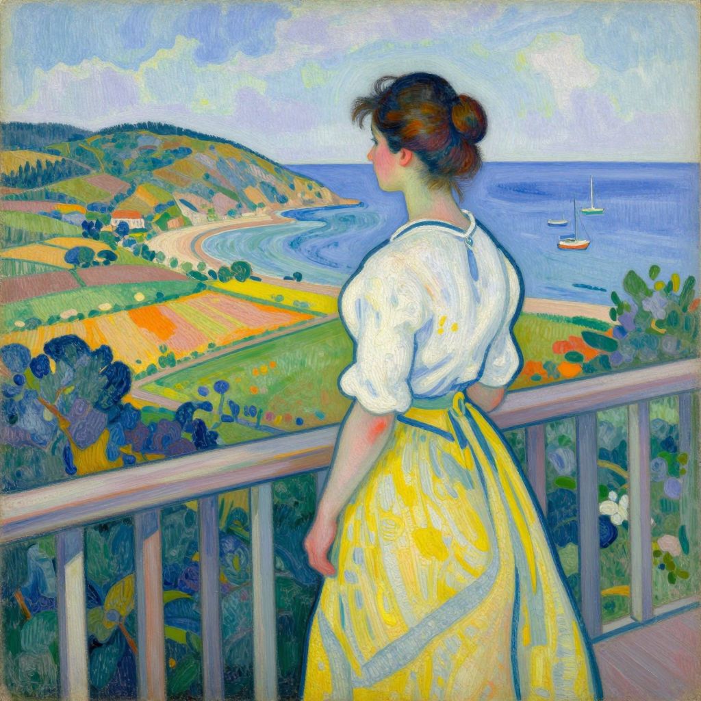 Post-Impressionist painting of a woman in a white blouse and yellow skirt, standing on a wooden balcony, gazing at a coastal landscape with
