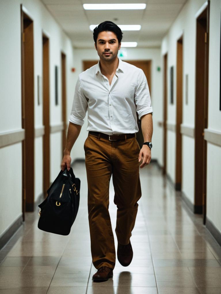 Dressy casual attire female, solo, male focus, shirt, 1boy, white shirt, pants, bag, brown pants, black hair, hallway, looking at viewer, realistic, indoors, standing, blurry, walking, full body