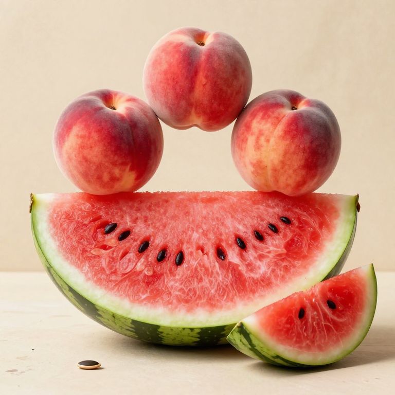 Vibrant still life composition featuring three ripe peaches arranged above a large watermelon slice, with a smaller watermelon piece and a seed resting to the side, all set against a rustic beige background.