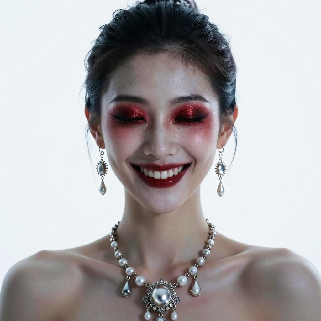 Close-up, portrait, symmetry, red exaggerate makeup, glitter powder, Eerie beauty, weird smile, Chinese zombie, jewelry, minimalist elegance, bare shoulders, high-definition fashion photography, high-end, ambiguous atmosphere, luminous and dreamlike scenes, light white and silver, romantic scenery, photo-realistic hyperbole, dark white and dark beige, Bright background, detailed depiction, Delicate face and costume details, cinematic lighting, chiaroscuro, hyperrealism, photography, HD Details, Detail Expression, Rich Details