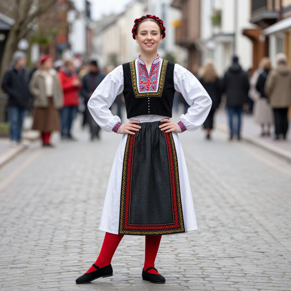 Photograph of a smiling woman in traditional Polish dress with white blouse, black vest, red socks, black shoes, and embroidered apron, standing on