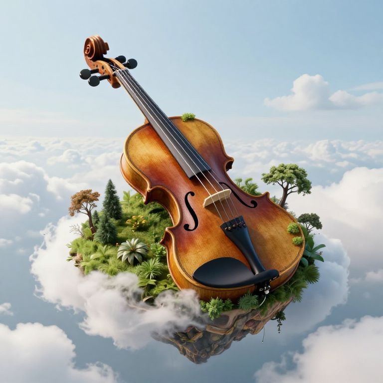 A colossal violin floats serenely above the clouds, its body transformed into a lush, verdant island where trees and foliage grow in perfect harmony with the instrument's curves, defying gravity and reality alike.