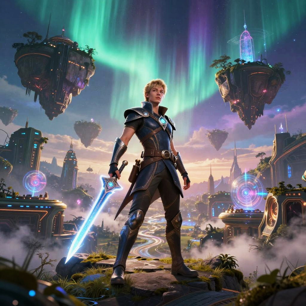 Ai movie cover generator crafting a fantasy adventure poster, mystical landscapes with floating islands and holographic elements, central hero figure with glowing weapon, vibrant aurora effects, detailed futuristic architecture, blend of science fiction and fantasy