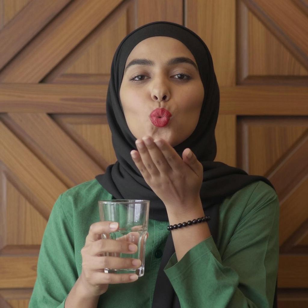 Photograph of a young woman with light brown skin and black hijab, wearing a green and black outfit, holding a glass in her right hand and blowing a kiss with her left hand. She has red lipstick and a beaded bracelet. The background features a wooden wall with geometric patterns.