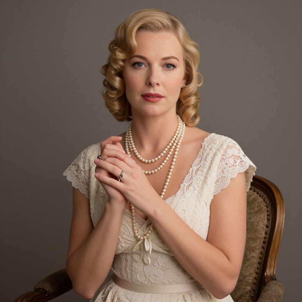Photograph of a fair-skinned, blonde woman with vintage, curled hair wearing a white, lace, short-sleeved dress. She is adorned with multiple strands of pearl necklaces and a ring on her right hand, which she holds up delicately. Her makeup is subtle with pink lipstick, and she gazes softly at the camera. She is seated on a brown, leather chair against a plain, gray background, creating a classic, elegant atmosphere. The lighting is soft, highlighting her features and the textures of her dress and jewelry.