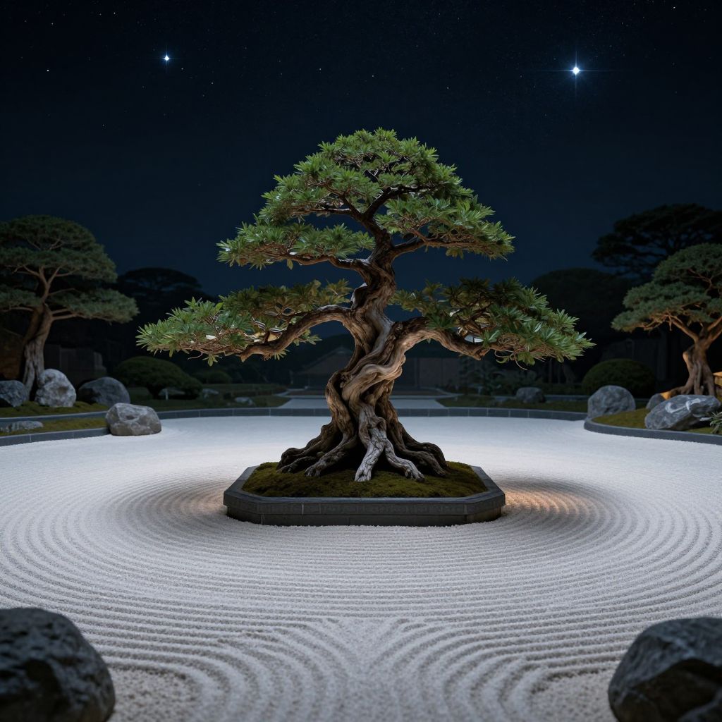 Envision an enchanting digital artwork influenced by the complex geometric patterns characteristic of Islamic artistry, portraying a tranquil Zen garden bathed in starlight. At its core lies an age-old bonsai tree, its twisted limbs extending towards the celestial realm. The scene showcases a harmonious interplay of light and darkness on the meticulously arranged white sand, creating an otherworldly ballet that evokes serenity and introspection. This captivating creation seamlessly blends the timeless beauty of nature with contemporary digital artistry, capturing the delicate equilibrium between raw natural forces and human artistic expression.