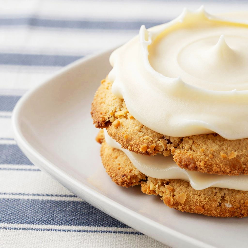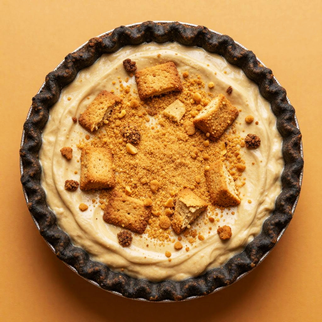 A top-down photograph of a rustic dessert pie with a flaky, wavy black glass crust. The pie is topped with a creamy, beige filling that's generously sprinkled with crumbled, golden-brown cookies. The background is a smooth, warm orange surface that contrasts with the pie's toppings. The lighting is bright, highlighting the textures and colors.
