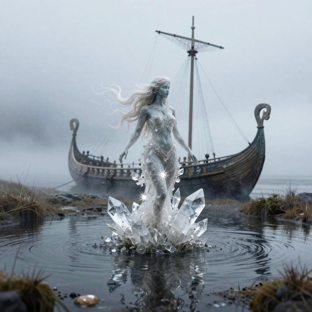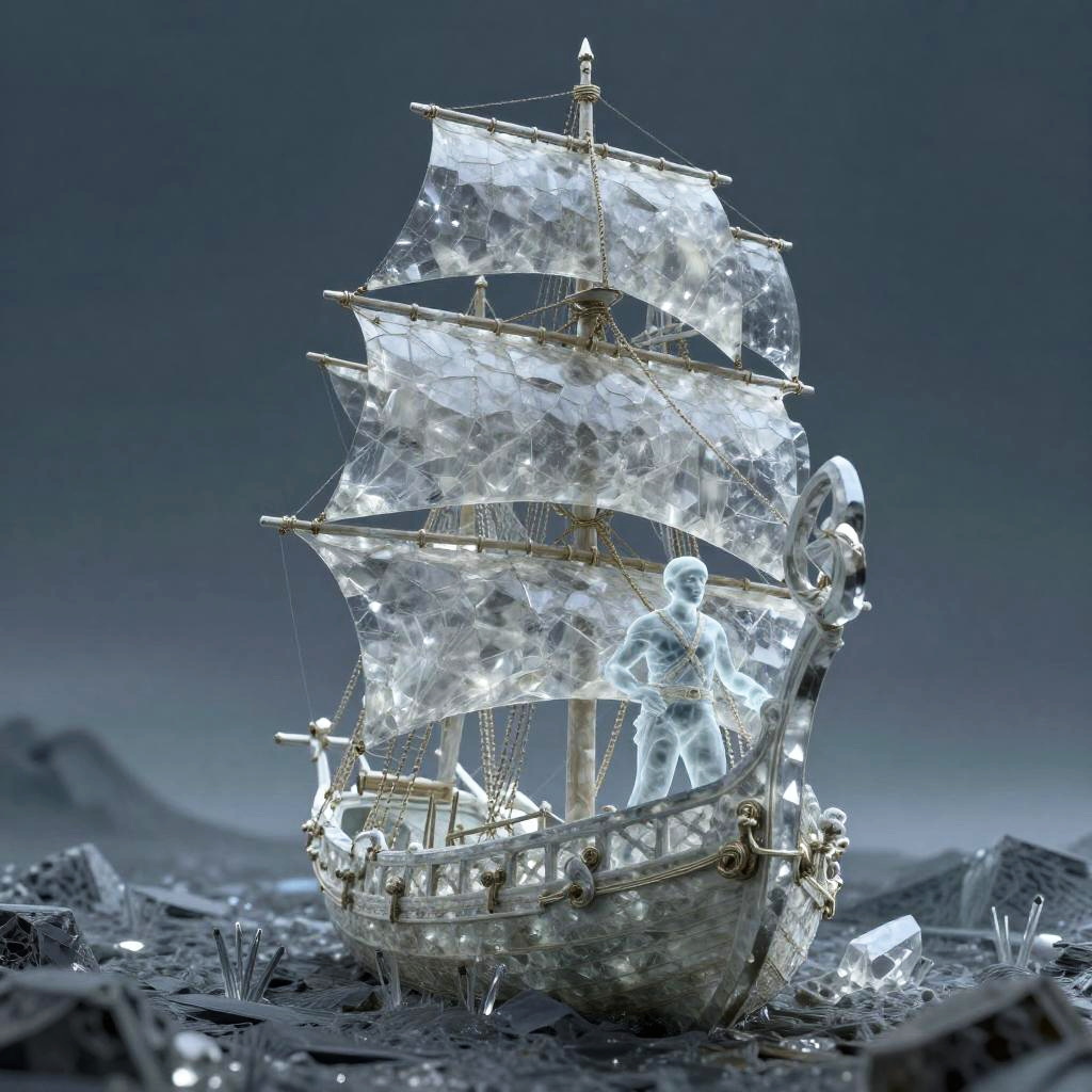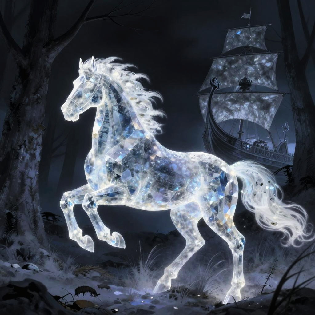 Crystal artwork in the style of Yoshitaka Amano, depicting a fantasy dragon on a desolate windswept moor with the prow of a ship behind, ethereal and atmospheric