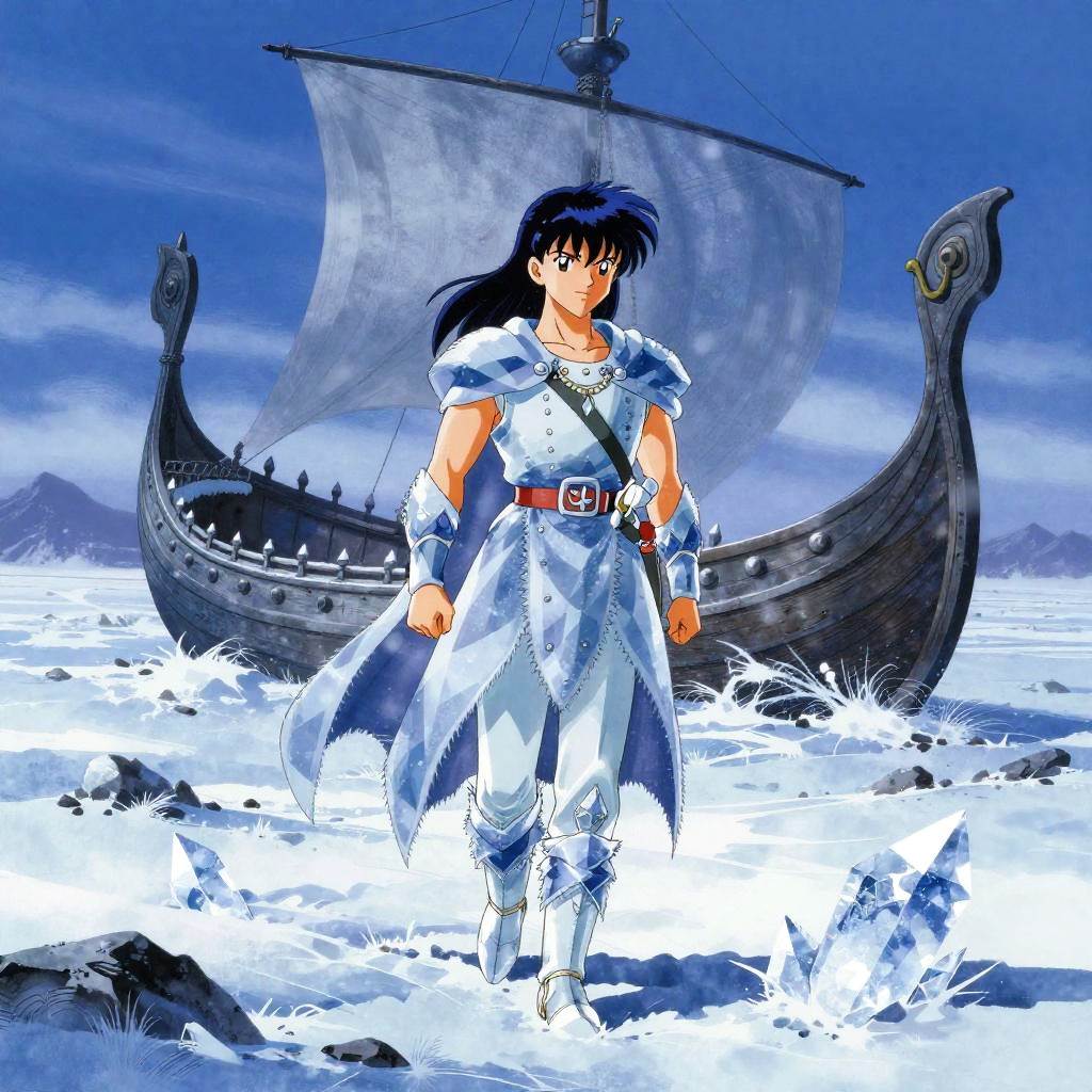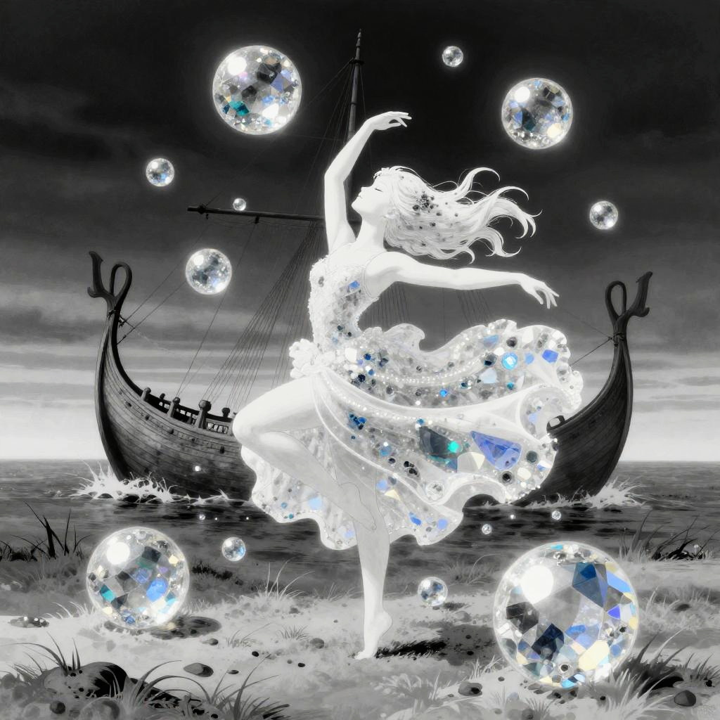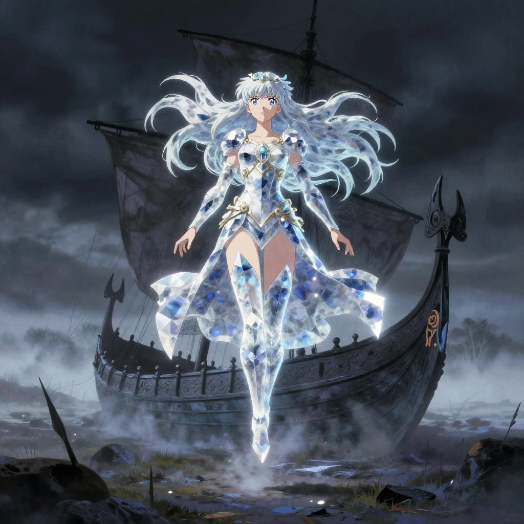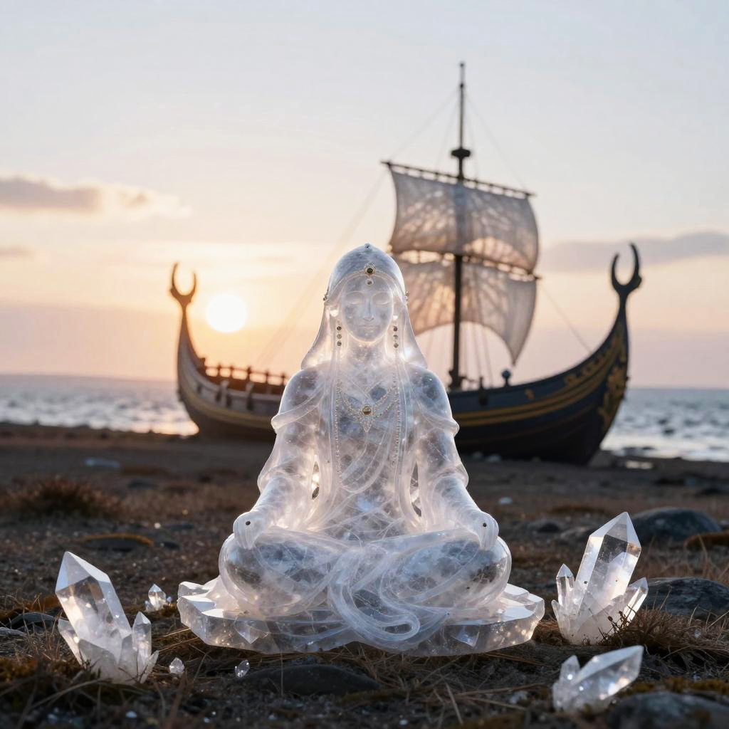 Crystal artwork in the style of Yoshitaka Amano, depicting a fantasy dragon on a desolate windswept moor with the prow of a ship behind, ethereal and atmospheric