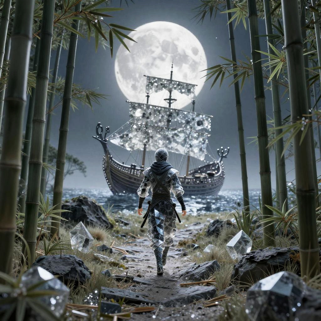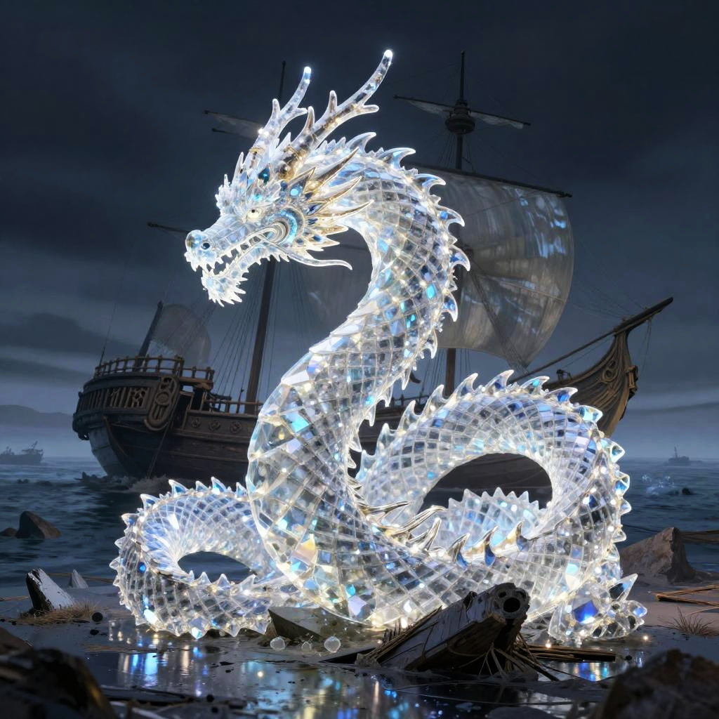 A crystal artwork inspired by Yoshitaka Amano's style, featuring a majestic fantasy dragon with intricate scales and flowing mane. The dragon emerges from swirling mist and water, coiling around the prow of an ancient ship with Asian architectural elements. The scene is set on a desolate, windswept moor with jagged rocks and a large full moon glowing in the atmospheric background.