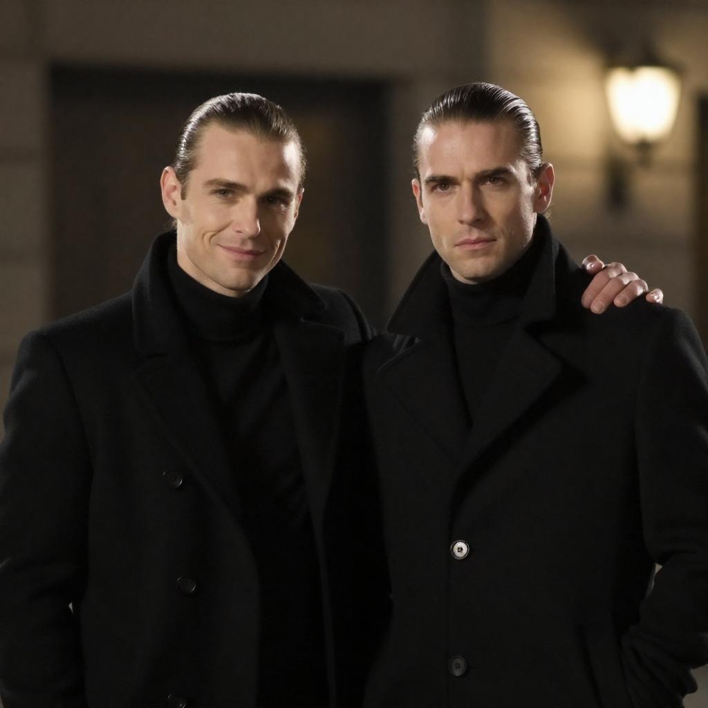 Photograph of two men with light skin and slicked-back hair, wearing black coats. The man on the left has a slight smile, while the man on the right looks serious, with his hand on the other's shoulder. Background is an urban, dimly lit setting with a warm light fixture.