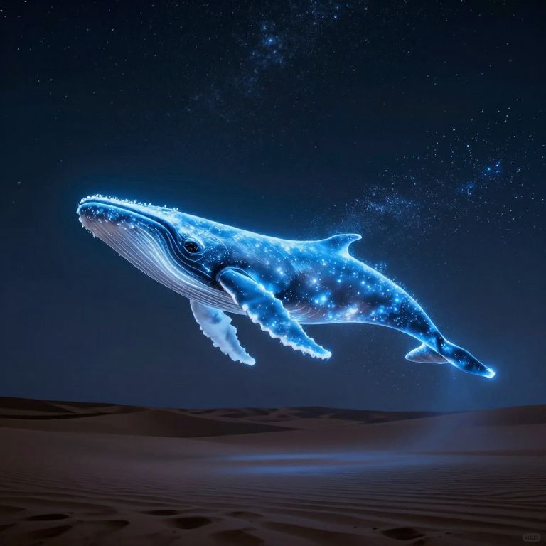 Digital artwork of a glowing, blue, bioluminescent whale flying through a starry night sky over a dark, sandy desert.
