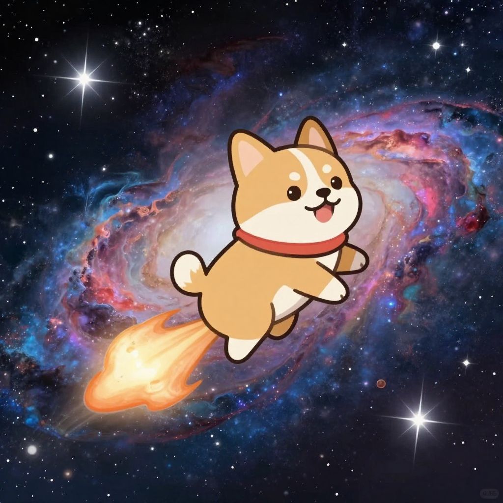 Doge in space riding a comet tail through a galaxy filled with sparkling stars and swirling nebulae, colorful cosmic clouds in the background, playful and fantastical atmosphere
