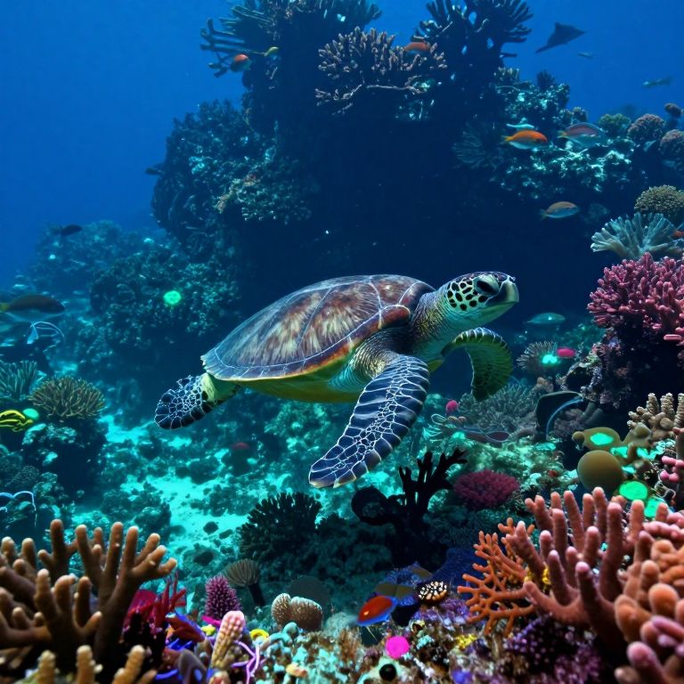 Photograph of a vibrant underwater scene featuring a sea turtle swimming gracefully amidst a colorful coral reef. The turtle has a greenish-brown shell with intricate patterns and is surrounded by a diverse array of corals, including red, orange, and purple corals in the foreground. The background showcases deeper blue water with darker, shadowy corals and small, brightly colored fish. The image is richly detailed, with a mix of soft and hard corals, and the lighting creates a striking contrast between the illuminated coral and the darker depths.