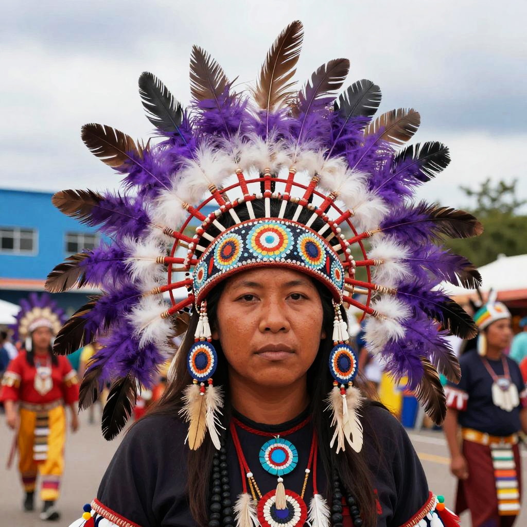 Photograph of a person with medium-brown skin and dark hair, dressed in a vibrant Native American-inspired costume with large, purple feathered headdresses. The headdresses feature intricate, colorful circular designs with feathers in the center. The background shows a cloudy sky, a blue building on the left, and other people in colorful costumes. The image has a slightly pixelated, digital art style.