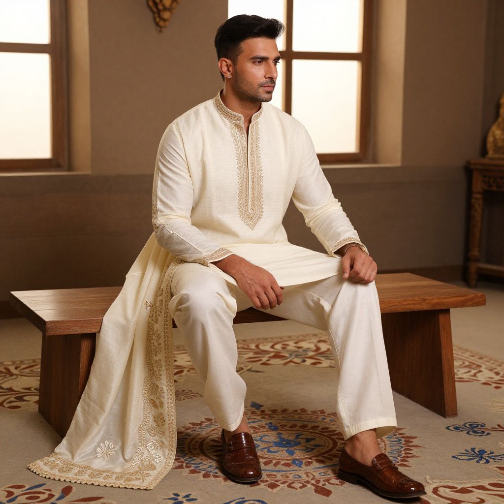 A high-resolution photo of a man in a meticulously designed Pakistani suit made with premium cotton and hand-embroidered details, sitting on a wooden bench in a heritage-themed studio in Islamabad, with traditional rangoli patterns on the floor and soft natural light filtering through a window.