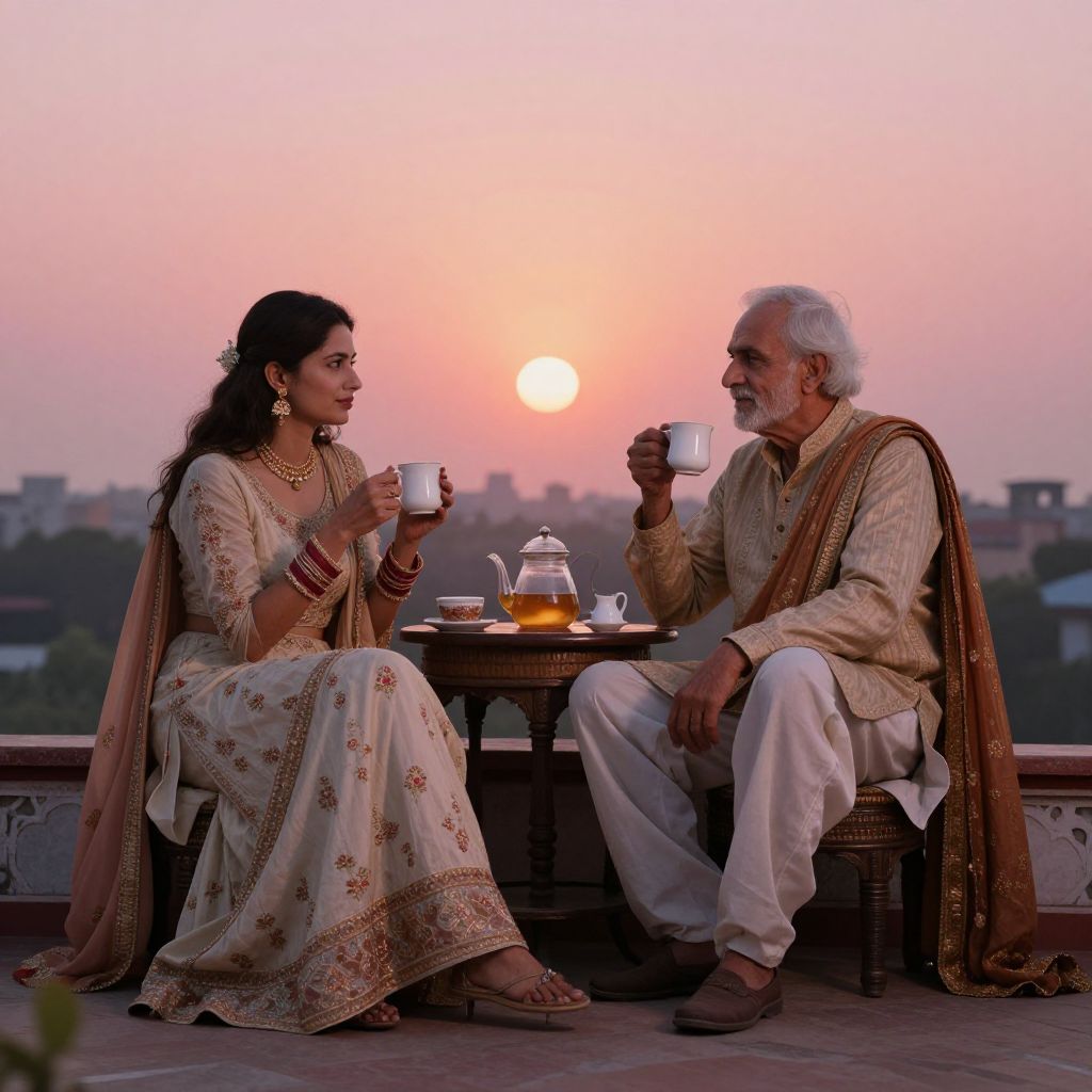 An old-world Indian couple sitting on a terrace in Chandigarh, enjoying tea under a pink sunrise, dressed in elegant ethnic wear, peaceful scene, soft golden light, cinematic composition, MidJourney style.