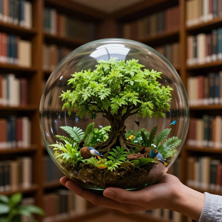 Librarian holding a transparent glass orb containing a miniature, self-sustaining ecosystem with a vibrant green tree, lush foliage, and small birds flying within, set against the backdrop of a dimly lit library filled with towering bookshelves.