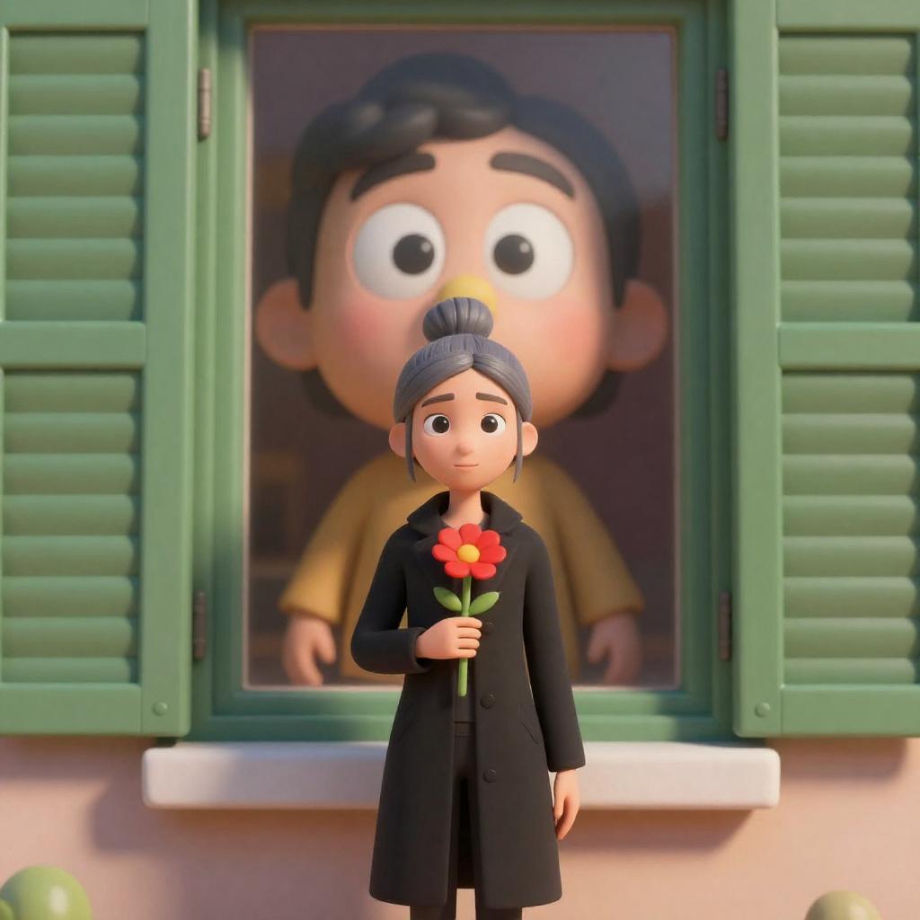Digital 3D animation featuring a woman with gray hair styled in a bun, wearing a black coat, holding a red flower. She stands in front of green shuttered windows, behind which a large cartoon character with black curly hair, wide eyes, and a yellow nose looks through the glass. The scene is brightly lit, highlighting the character's face.
